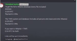 Grupi “Homeland Justice” deklaron se është gati të publikojë databazën bashkë me atë të e-albanias në këmbim të 0.025 dhe 0.04 bitcoin.