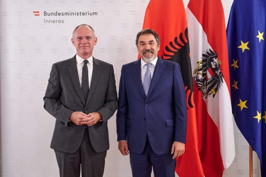 📍Vjenë – Takimi me homologun tim austriak Gerhard Karner, me të cilin diskutuam çështje të bashkëpunimit dypalësh në fushën policore, luftën kundër krimit të organizuar, terrorizmit, sulmeve kibernetike dhe emigracionit të paligjshëm. Për këtë të fundit, ministri Karner vlerësoi Shqipërinë për masat e ndërmarra si një vend tranzit në bllokimin e flukseve migratore të paligjshme nga vendet e Afrikës apo Lindjes së Mesme drejt Europës. Kemi nisur një bashkëpunim me #AlpinPolizei të Austrisë, për të trajnuar #FNSH në alpet tona, në mënyrë që edhe Shqipëria të ketë një strukturë të posaçme e të specializuar për zonat alpine. Historikisht Austria ka qenë një vend mik për Shqipërinë dhe mbështetës i palëkundur prej momenteve të para të krijimit të shtetit shqiptar e deri më sot teksa jemi në rrugën e pakthyeshme të anëtarësimit në #BE. 🇦🇱🤝🇦🇹