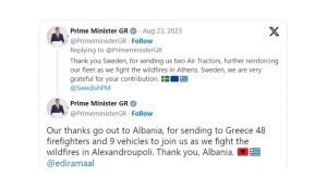 “Falënderimet tona shkojnë për Shqipërinë, që dërgoi në Greqi 48 zjarrfikës dhe 9 automjete për t’u bashkuar me ne për të luftuar zjarret në Aleksandropoli. Faleminderit Shqipëri”, shkroi Mitostakis në një postim në Twitter.